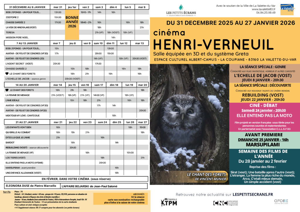 Accueil LES PROGRAMMES MENSUELS PROGRAMME DU 2 AU 27 JANVIER 2026 - SAINT MANDRIER SUR MER PROGRAMME DU 31 DECEMBRE 2025 AU 27 JANVIER 2026 - LA VALETTE DU VAR PROGRAMME DU 31 DECEMBRE 2025 AU 26 JANVIER 2026 - LE PRADET NOS ÉVÉNEMENTS RECEVOIR LE PROGRAMME PAR MAIL Pour recevoir le programme mensuel et la programmation hebdomadaire JE M'INSCRIS !