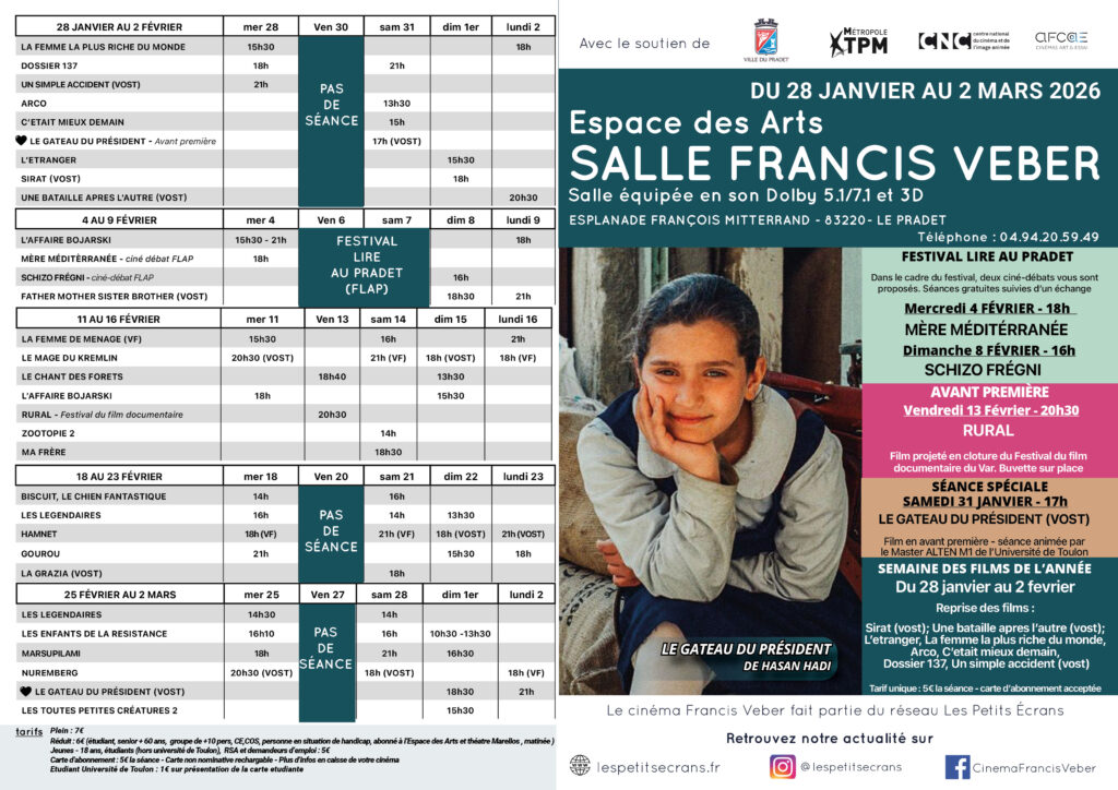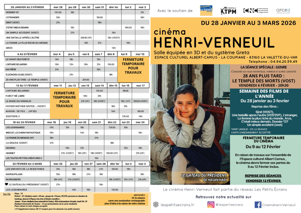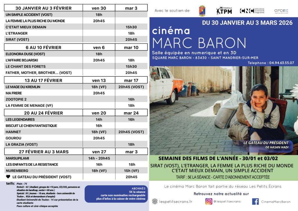 Accueil LES PROGRAMMES MENSUELS PROGRAMME DU 2 AU 27 JANVIER 2026 - SAINT MANDRIER SUR MER PROGRAMME DU 31 DECEMBRE 2025 AU 27 JANVIER 2026 - LA VALETTE DU VAR PROGRAMME DU 31 DECEMBRE 2025 AU 26 JANVIER 2026 - LE PRADET PROGRAMME DU 30 JANVIER AU 3 MARS - SAINT MANDRIER SUR MER PROGRAMME DU 28 JANVIER AU 03 MARS 2026 - LA VALETTE DU VAR PROGRAMME DU 28 JANVIER AU 2 MARS 2026 - LE PRADET NOS ÉVÉNEMENTS RECEVOIR LE PROGRAMME PAR MAIL Pour recevoir le programme mensuel et la programmation hebdomadaire JE M'INSCRIS !